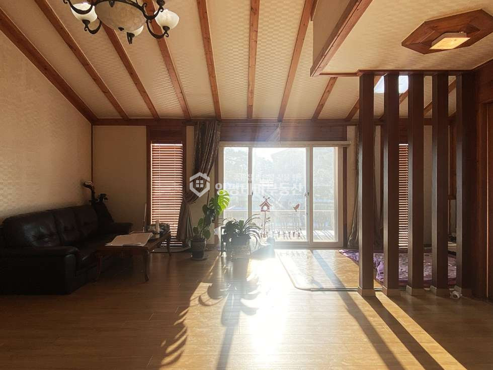 - 거실은 박공 지붕이며 한쪽 벽면에 유광타일 아트월 처리되어 있음